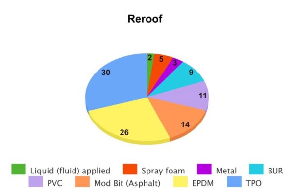 The 2015-2016 NRCA Market Survey http://www.nrca.net/2016-market-survey shows that roof system types throughout the U.S. continue to reflect the recent trends in low slope commercial roofing applications. The survey results show TPO as the low-slope market leader, garnering a 40 percent share of the new construction market and 30 percent of the reroofing market. EPDM follows next, capturing 22 percent of market share for new construction and 26 percent of the reroofing market. In third place is Mod Bit at 12.4 percent of the new construction market and 14 percent of the reroofing market. Market share for these and other system solutions follow by percentage in the chart below: