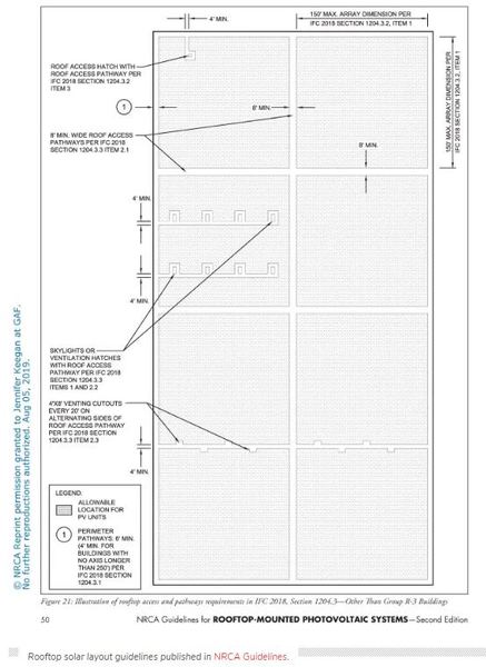 The layout of solar arrays should also address access for solar installation, solar array and roof maintenance, and fire safety. Safe access of the solar contractors and electricians during installation, as well as service and maintenance over the service life of the solar arrays must be accounted for in the design. This may include davits or other tie-off points, perimeter access, and consideration to proximity of overhead power lines. The NRCA Guidelines conveniently summarize the requirements from the International Fire Code (IFC) and National Electric Code (NFPA 70). Generally, they require a 4-foot perimeter around roof edges, hatches and a pathway between the two, as well as a pathway along both centerline axes. They also recommend a 4-foot wide pathway to skylights, ventilation hatches and roof stacks for future serviceability. Best practices for fire safety include 8-foot wide pathways for smoke ventilation between panel arrays, and getting approval from the local fire chief.